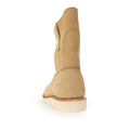 ペコスブーツはレッドウィング社の開発した、ウエスタンブーツタイプのワークブーツです。レッドウィング社はかつてテキサスに拠点を持ち、1930年代にはウエスタンブーツも販売していました。このウエスタンブーツにレッドウィング社が得意とする機能本位のワークブーツのデザイン手法を用いて、シンプルかつ頑丈で様々なワークに使えるブーツとしたものがペコスブーツです。#8168はベージュ色のラフアウトレザー、ホーソーン・アビレーンを使ったモデル。このレザーはレザーの起毛面を薄くスライスしてつくる多くのスエードレザーと違い、レザーの繊維密度が最も高い部位である銀面(レザー表面)を内側に使い起毛面を外側に使う、つまりレザーを裏返して使うラフアウトレザーであり、元々アウトドア用の靴に多く用いられるものでした。履き込んでいくと汚れなども深い味わいとなる、経年変化が楽しめるレザーです。