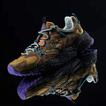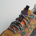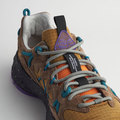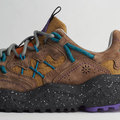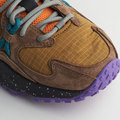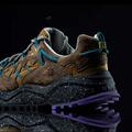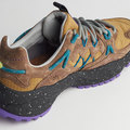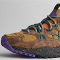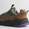 太さの異なる2種類のレースを使用した無骨なデザインが特徴のYAMABUSHI。ボディーにはナイロンを使用し、オーバーレイのレザーと組み合わせることで、足のブレによる衝撃を効果的に軽減する構造となっています。はるか昔から穏やかに暮らし、そして谷を渡り、山々を駈ける 山伏。そんな日本文化に敬意を表したプロダクトです。 新ソールは接地面にフロント、ミッド、リアの3つのセクションに異なるラバーを配し、各セクションに独自の機能を搭載しています。