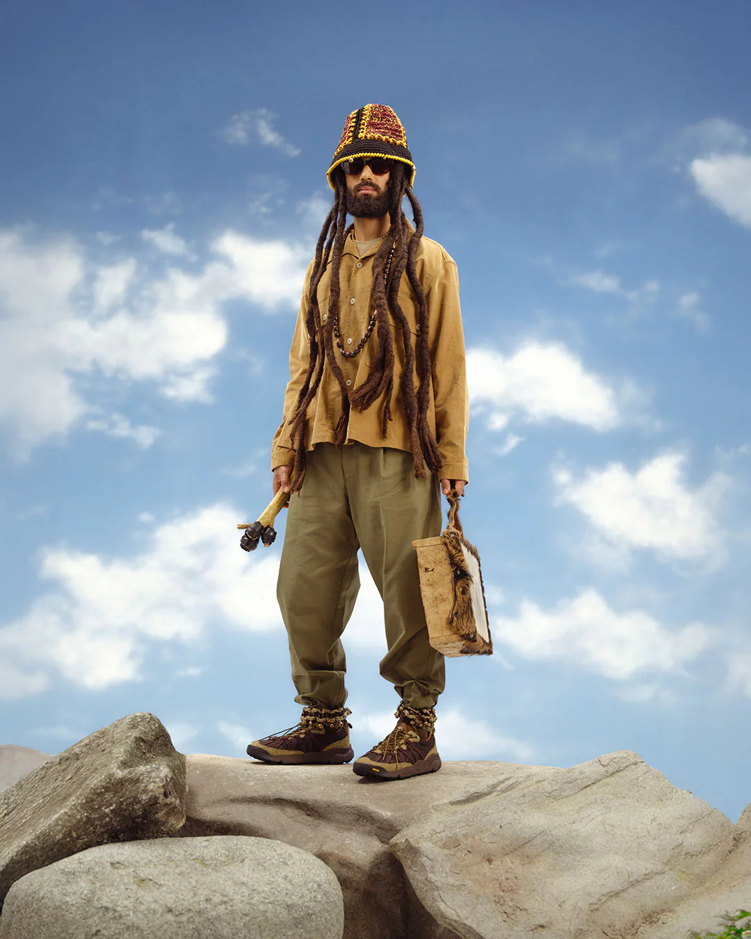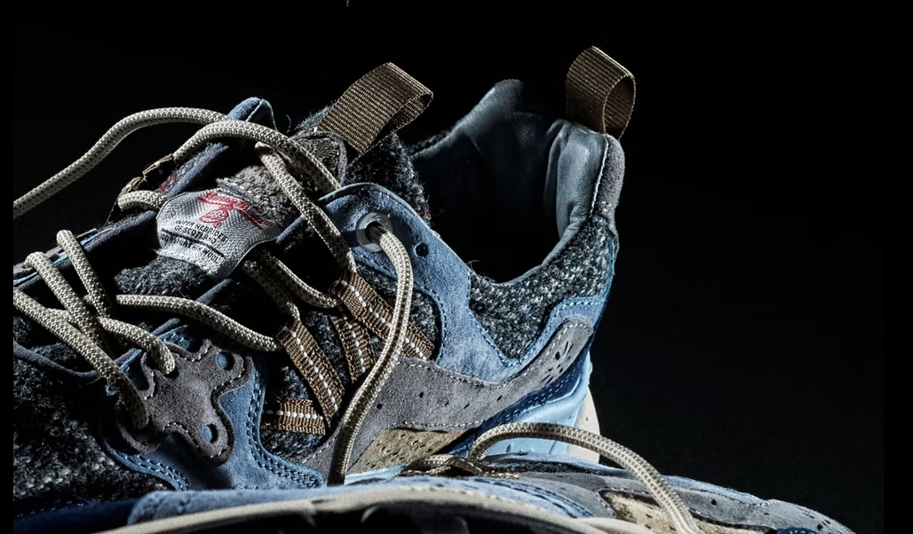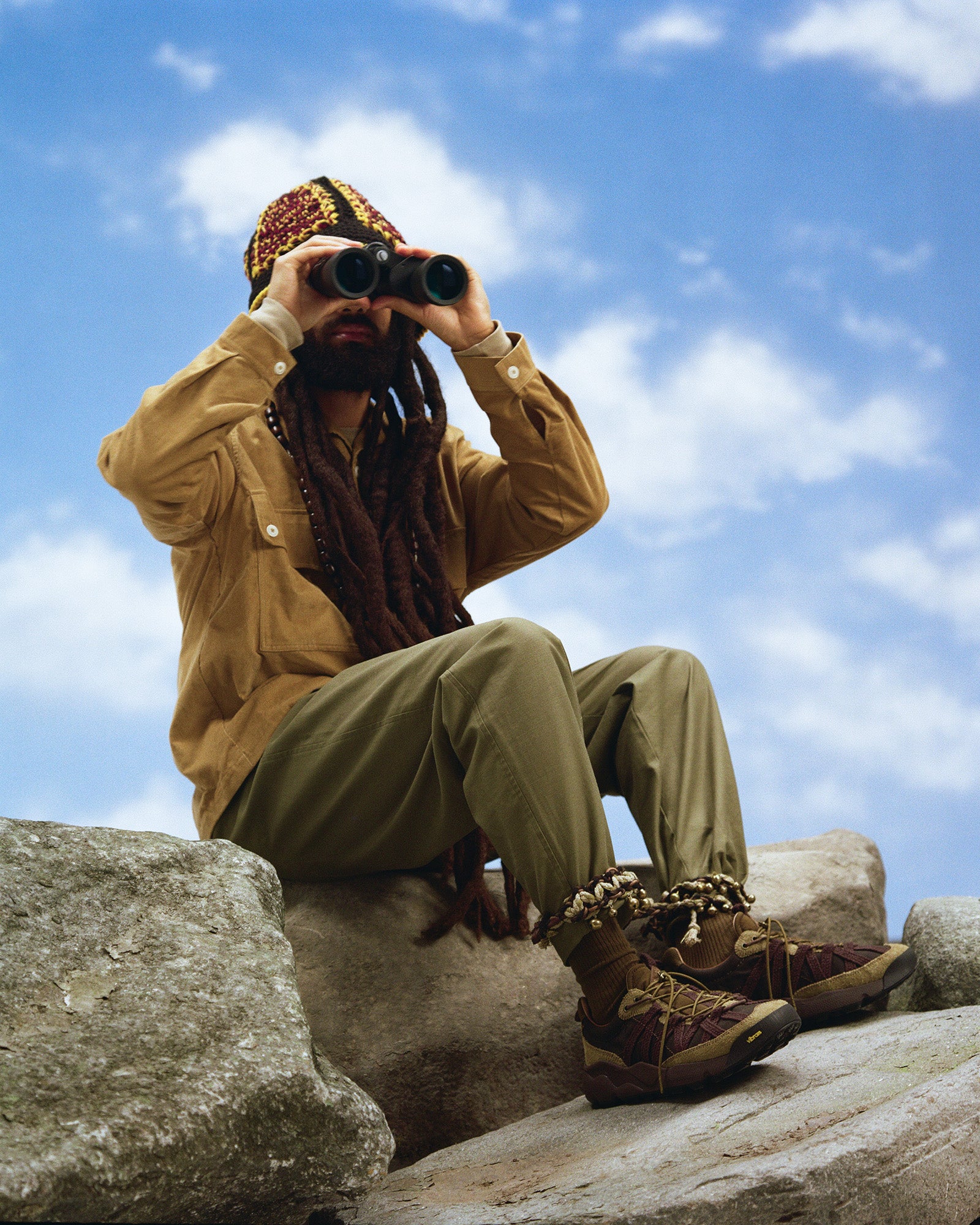 撥水性のある日本製リサイクルナイロンと天然ワックスコットンを組み合わせることで、アウトドアの地形で優れたパフォーマンス特性を実現。ニコラス・デイリーのシグネチャータータンインソール、アンティークブラスのディテール、フラワーマウンテンのシグネチャーデザインのビブラムソールなどで構成されており、その中でも洗練された触感のカスタムコットンへリンポーンテープレースは注目。