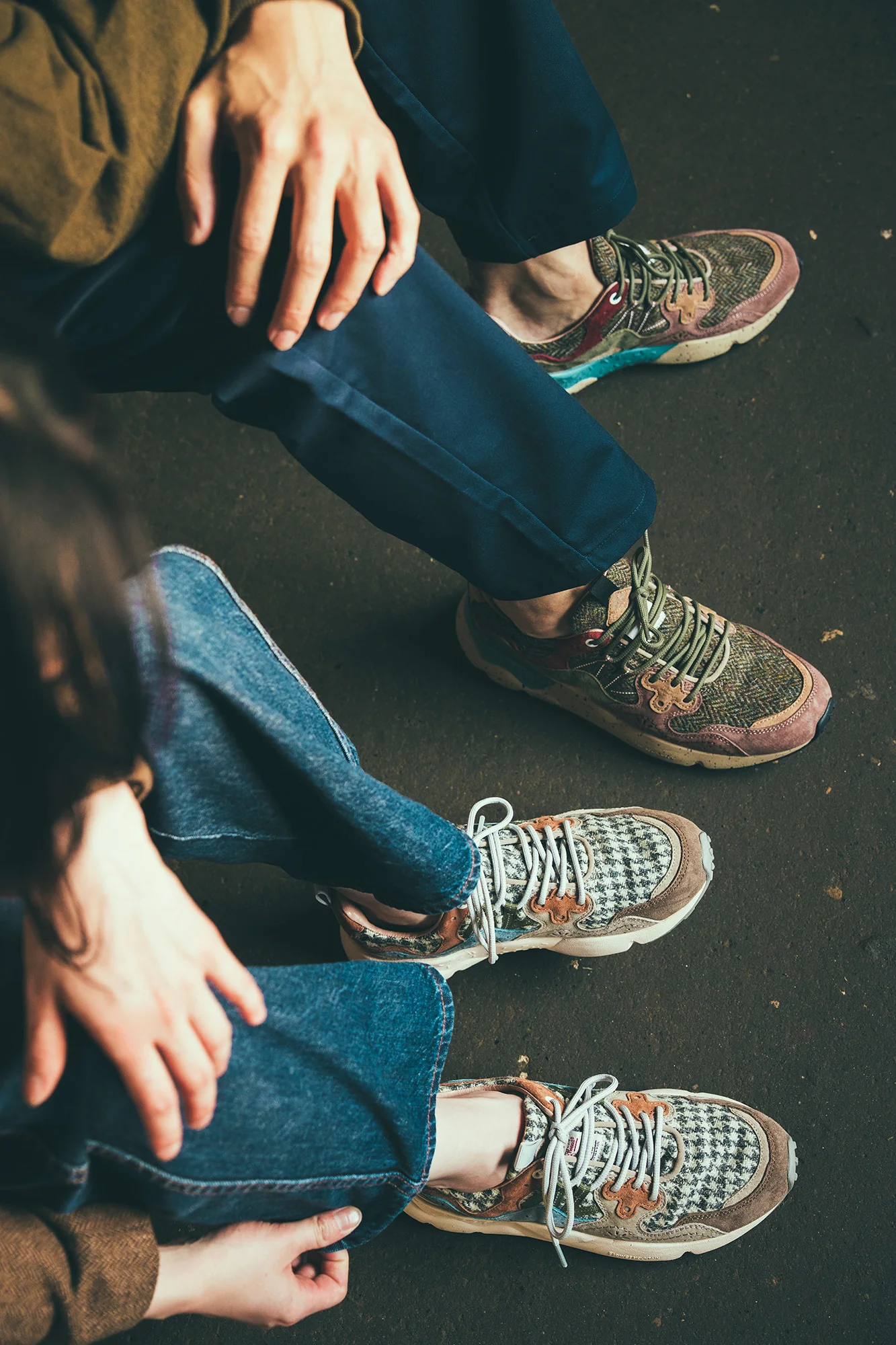 アウターヘブリディーズ諸島で採れた羊毛を使い、染色から成形、仕上げまで島民が行い、手織りの編み機で作られた1909年から粛々を作り続いているツイード生地"Harris Tweed -ハリスツイード"をアッパーに使用。Green&brown herringbone、Grey&white houndstooth、Grey shadow checkの3色のラインナップ。
