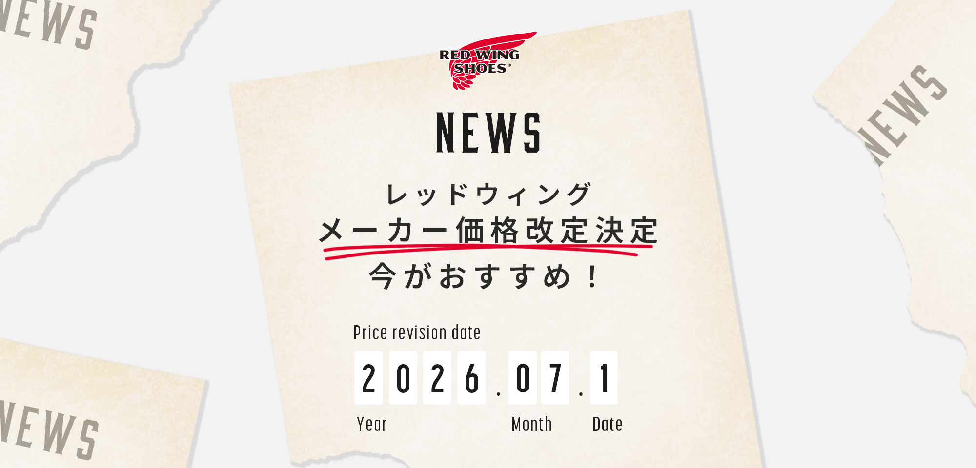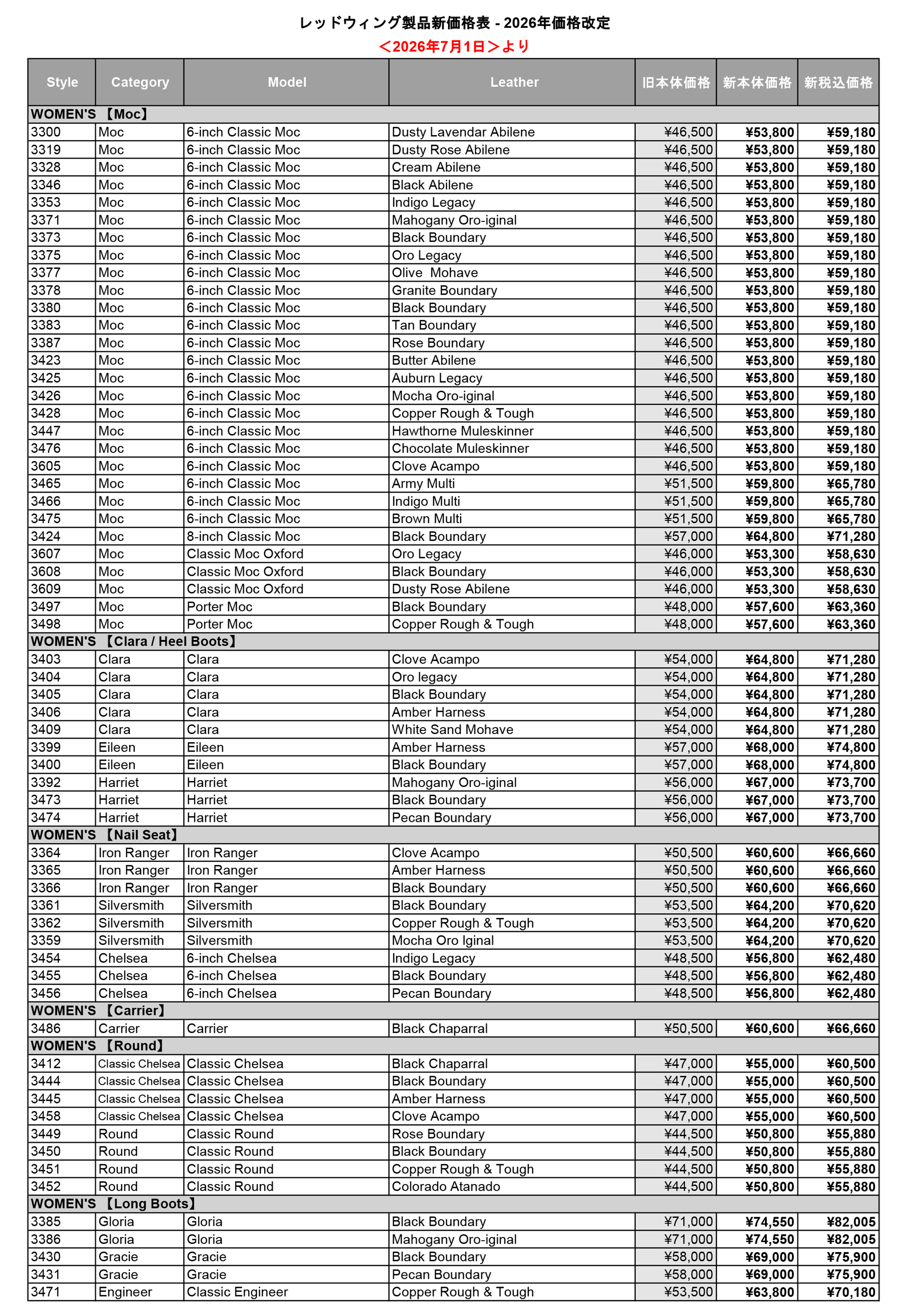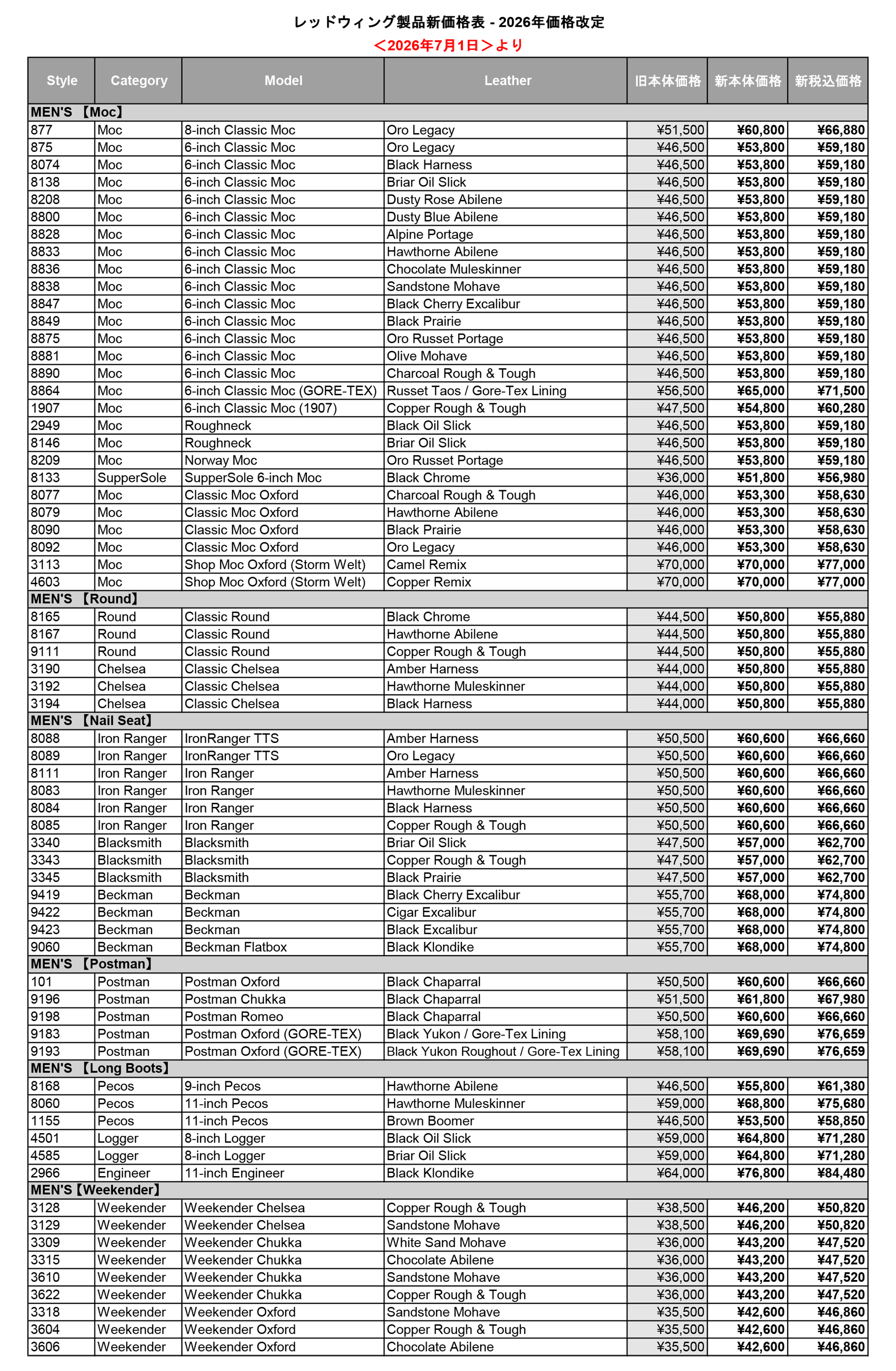 この度、レッドウィング商品価格の改定がメーカーより発表されました為、2026年7月1日より下記の通り改定させていただきます。